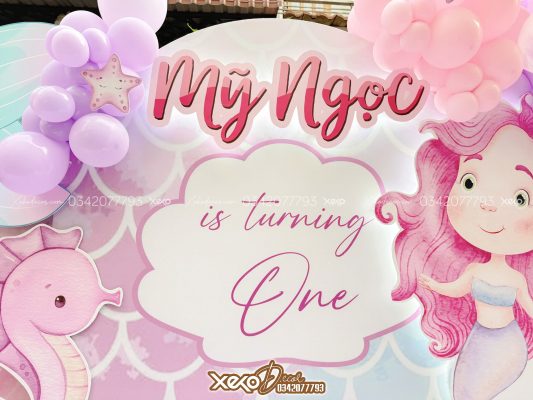 Với chủ đề Nàng Tiên Cá, không gian buổi tiệc của bé Mỹ Ngọc như một đại dương thu nhỏ, nơi có những sinh vật biển đáng yêu, ánh sáng lấp lánh và nàng tiên cá xinh đẹp. Đây không chỉ là background hoàn hảo cho những bức ảnh kỷ niệm, mà còn tạo nên một không gian đầy màu sắc, tươi vui, giúp bé và khách mời có những phút giây đáng nhớ.