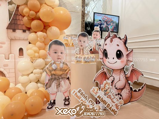 Mẫu trang trí thôi nôi bé trai chủ đề Rồng Bé Dễ Thương tông cam kem – trắng đang được nhiều gia đình yêu thích bởi sự dễ thương, ấm áp và vô cùng nổi bật. Thiết kế từ Xeko Decor mang đến một không gian tiệc ngọt ngào, đậm chất cổ tích cho ngày đặc biệt của bé.
