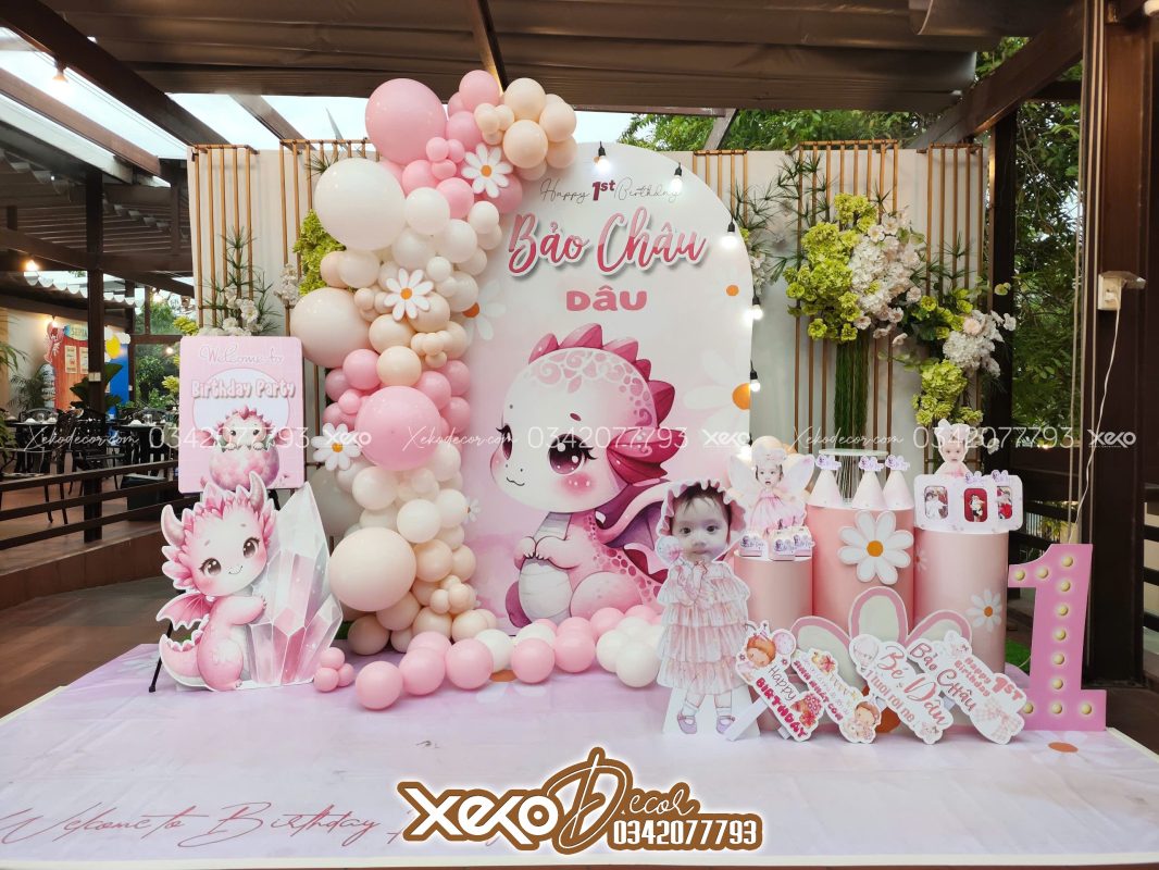 Backdrop được thiết kế nổi bật với gam màu hồng – trắng, kết hợp hình ảnh bé và linh vật rồng nhỏ. Bố cục vòng cung mềm mại tạo nên sự cân đối và dễ thương, phù hợp với tiệc dành cho bé gái. Đây cũng là điểm nhấn trung tâm giúp buổi tiệc trở nên lung linh và là nơi lý tưởng để khách mời chụp hình kỷ niệm.