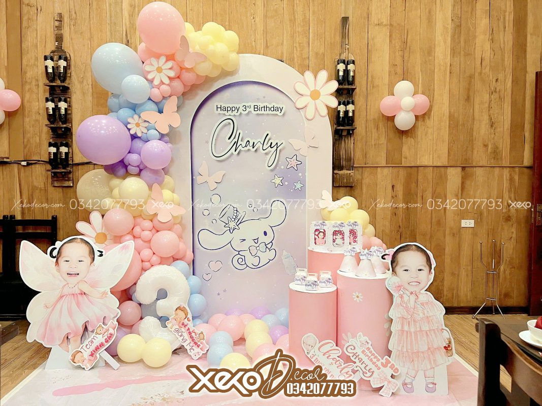 Backdrop dạng vòm bo tròn mềm mại, phối màu hồng – tím – vàng nhạt mang đến sự nhẹ nhàng và hiện đại. Trên backdrop, tên bé và chi tiết trang trí được thể hiện tinh tế, trở thành điểm nhấn chính cho toàn bộ bữa tiệc. Đây cũng là nơi lý tưởng để chụp ảnh lưu giữ kỷ niệm đáng nhớ.